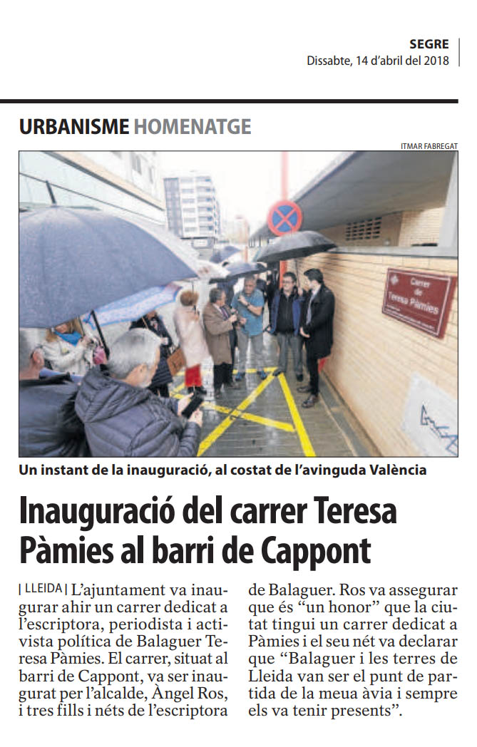 El carrer Teresa Pàmies de Lleida es va poder inaugurar, finalment, en presència de la seva família, tres anys després que l'Ajuntament de Lleida ho aprovés en consell municipal.
