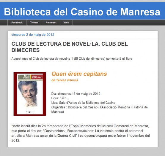 Dins de les activitats del "Club de lectura dels dimecres" que organitza la Biblioteca del Casino de Manresa, el dia 16 d'aquest mes comentaran el llibre de Teresa Pàmies "Quan érem capitans".