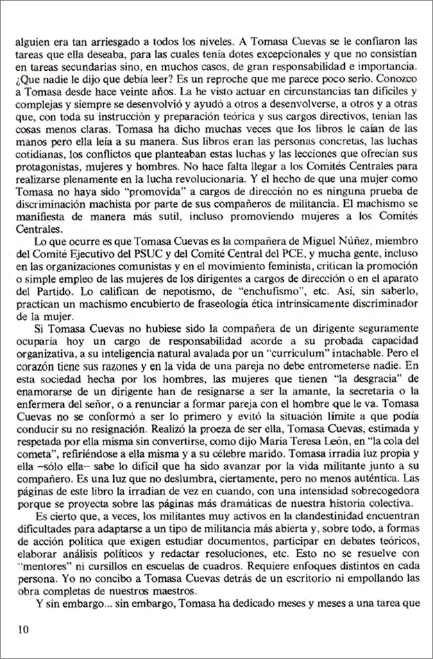 Filla d'una família molt humil de l'Alcàrria, la militant comunista Tomasa Cuevas (1917-2007) va començar a treballar en una fàbrica als nou anys i als catorze ja estava afiliada a les Juventuts Comunistes. Acabada la guerra va passar per set presons. A la Prefactura de Policia de la Via Laietana va ser terriblement torturada pel cap de la Brigada Político-Social, Antonio Creix, i pel comissari Pedro Polo, ambdós d'infausta memòria.