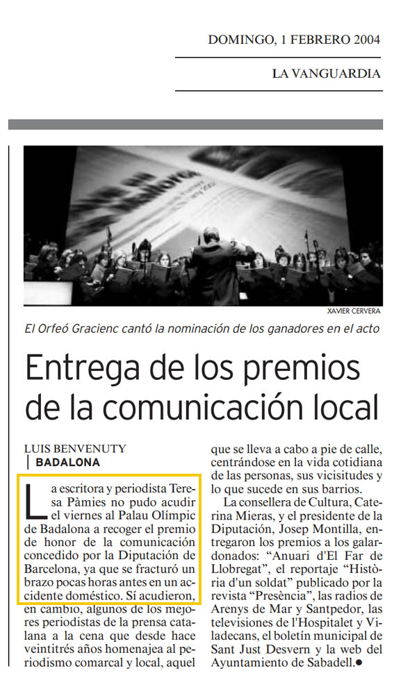 Premi sense dotació econòmica que concedeix la Diputació de Barcelona amb la finalitat de retre homenatge a una persona, mitjà de comunicació o organisme públic o privat, que hagi destacat per la seva trajectòria a favor de la comunicació a Catalunya. La cerimònia de lliurament dels Premis de Comunicació Local va tenir lloc al Pavelló Olímpic de Badalona. Teresa Pàmies no va poder assistir a l'acte a causa d'una fractura al braç que es va fer poques hores abans. La degana del Col·legi de Periodistes, Montserrat Minobis, va ser l'encarregada de recollir el guardó. |